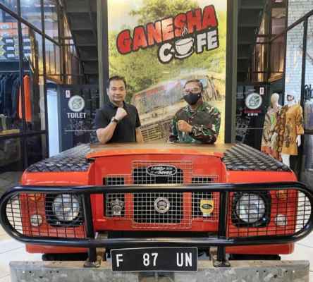 Aroma outdoor activity terasa saat mau masuk ke dalam Ganesha Cafe. Ada muka mobil Land Rover berwarna merah yang identik dengan olahraga otomotif Off Road.