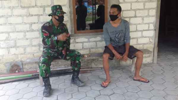 Anggota Satgas TMMD Kodim 0813 Bojonegoro, Koptu Arif, bersama Ketua RT 01, Desa Ngrancang saling bercengkerama saling memberi masukan dan membicarakan manfaat adanya program TMMD bagi masyarakat.