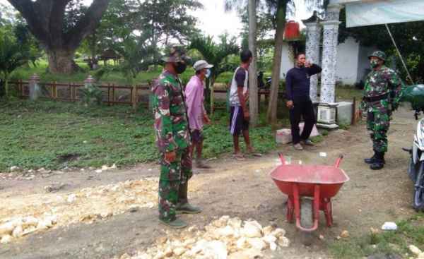 Bojonegoro – Personil Satgas TMMD 110 Kodim 0813/Bojonegoro bekerja bersama warga perbaiki jalan di Desa Jatimulyo, Kecamatan Tambakrejo, Kabupaten Bojonegoro, Jawa Timur, Jum’at (19/2/2021).
