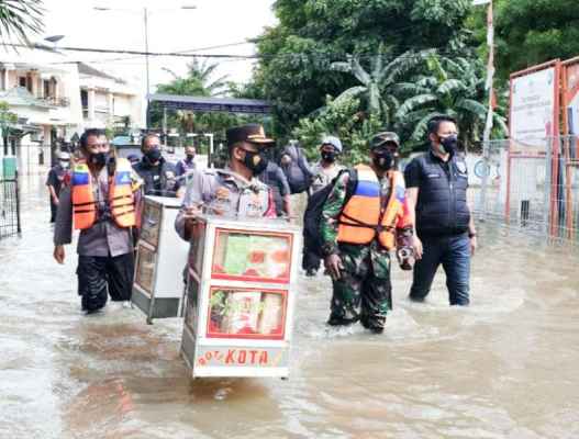 JAKARTA – Kapolsek Kembangan Jakarta Barat,Kompol H. Khoiri rela mengarungi banjir dengan memanggul gerobak roti untuk di bagikan pada korban banjir di kawasan Kembangan Utara.