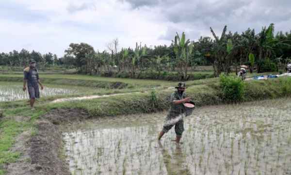 BOJONEGORO – Dengan terjun langsung ke sawah, Satgas TNI Manunggal Membangun Desa (TMMD) ke 110 Kodim 0813/Bojonegoro bantu petani memupuk tanaman padi.