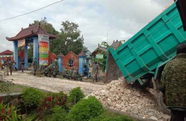 Di bawah pimpinan Kapten Inf Jamari para personel Satgas TMMD ke-110 ini memandu material batu Urug yang datang di lokasi pembangunan jalan aspal.