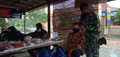 BOJONEGORO – Kopda Anang Anggota Satgas TMMD ke-110 Kodim 0813/Bojonegoro memberikan masker kepada warga Desa Jatimulyo, Kecamatan Tambakrejo yang ke warung kopi dekat Balai Desa Jatimulyo,Selasa (02/03/2021).