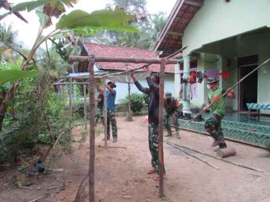 JAMBI- Satgas TMMD ke 110 Kodim 0415/Batanghari dari satuan Yonzipur 2/SG, di Desa Sungaiterap, membantu orang tua asuhnya dalam membuat jemuran pakaian, Sabtu (6/3/2021) pagi.