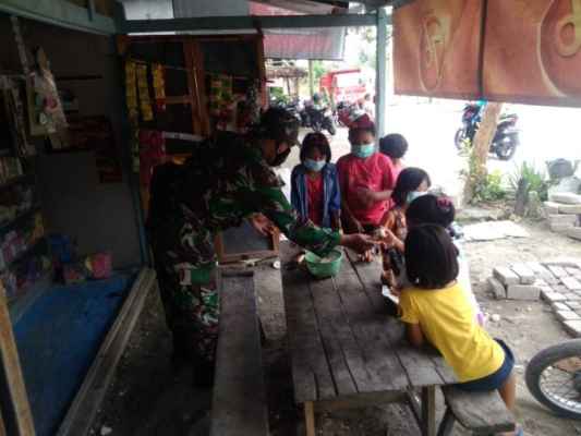 Tak hanya melakukan komsos, para anggota TNI juga membagikan makanan dan menunjukkan kedekatannya dengan anak-anak.