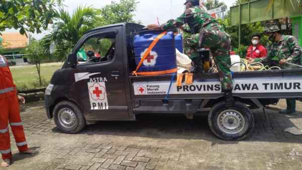 “Kali ini kita membantu pengisian cairan penyemprotan desinfektan dengan tim PMI Bojonegoro,” kata Sertu Sugianto, Jum’at (5/3/2021).