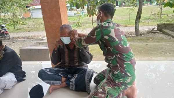 Salah satu Personil TMMD ke-110 Koptu Benny melaksanakan pembagian masker kepada warga dan melakukan Himbaun Protokol kesehatan kepada Masyarakat