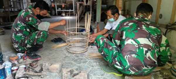 Anggota Satgas TMMD ke 110 Kodim 0813/Bojonegoro Koptu Kasturi itu belajar merakit sangkar burung bersama Badri (63) Warga Desa Jatimulyo RT 04 RW 02 Kecamatan Tambakrejo, Selasa (9/3/2021).
