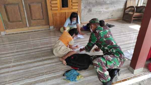 Bojonegoro – Koptu Aris Widodo, salah satu prajurit yang tergabung dalam Satgas TMMD Ke 110 Kodim 0813/Bojonegoro, Jawa Timur, ikut membantu anak-anak yang belajar secara daring.