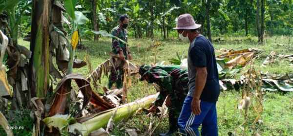 Bojonegoro – Personel Satgas TMMD Ke 110 Serda Dwi Purnomo dan Koptu Aris Widodo membantu Wiwik Rahayu warga RT 18 RW 05 Dusun Ngrambah, Desa Ngrancang, Kecamatan Tambakrejo, Bojonegoro mengambil Gedebok Pisang yang akan di buat Keripik.
