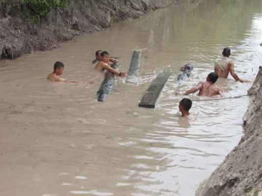 Sebelumnya, para Satgas tersebut bersama warga menghanyutkan balok kayu yang sudah diikat itu ke sungai. Balok-balok kayu itu menyusuri sungai hingga sampai tujuan sekira 3 kilo meter.