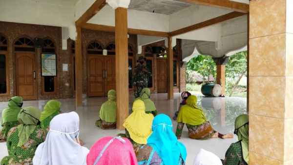 BOJONEGORO – Kopda Anang Yuni Satgas TNI Manunggal Membangun Desa (TMMD) 110 Kodim 0813/Bojonegoro Dampingi ibu Sri Andani saat memimpin jamaah yasinan.