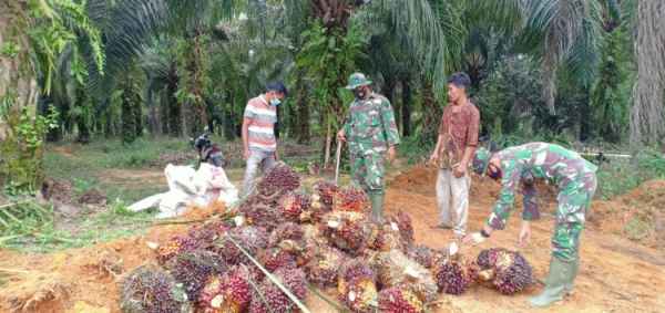 JAMBI- Melihat warga melakukan panen buah kelapa sawit membuat personel Satgas TMMD 110 Kodim 0415/BTH tergerak hatinya untuk membantu panen sawit.