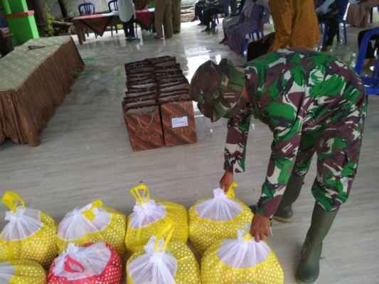 Bojonegoro – Anggota Satgas TMMD Serda Eko sedang menyiapkan paket sembako dari Dinas Sosial Bojonegoro. Pemberian ini di berikan kepada warga lanjut usia atau lansia di Desa Ngrancang Kecamatan Tambakrejo Kabupaten Bojonegoro.