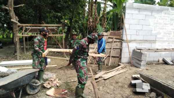 BOJONEGORO – Personel Satgas TMMD Ke-110 Kodim 0813 /Bojonegoro dan warga Desa Jatimulyo Kecamatan Tambakrejo bahu membahu memasang Gawangan pintu rumah Bapak Yateman (60).