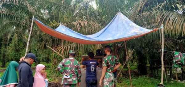 JAMBI- Dan SSK TMMD Kodim 0415/Batanghari membantu tukang pembuat tugu TMMD di Desa Sungaiterap, Senin (23/3/2021).