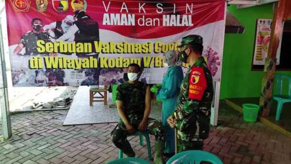 Sebelum dilakukan vaksinasi para anggota terlebih menunggu untuk gilirannya. Setelah menunggu lama dengan berbagai pemeriksaan kini giliran Serda Dwi jalani suntik vaksinasi yang dilakukan oleh puskesmas Kecamatan Tambakrejo Kabupaten Bojonegoro.