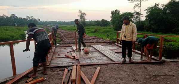 JAMBI- Meskipun hujan, Satgas TMMD ke 110 Kodim 0415/Batanghari bersama tukang melanjutkan pengerjaan jembatan di Desa Sungaiterap, Selasa(23/3/2021) kemarin.