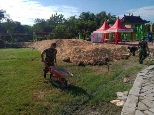 Tampak dalam kegiatan itu sejumlah TNI sedang membawa gerobak pengangkut tanah yang selanjutnya akan digunakan menutup kubangan air.