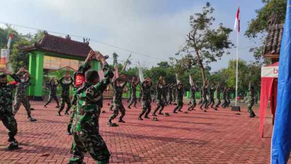 Para personel Satgas TMMD ke-110 ini menggelar senam bersama di halaman Balaidesa Ngrancang, Kecamatan Tambakrejo, Kabupaten Bojonegoro, Jawa Timur yang dipimpin langsung oleh Danton, dan Dan SSK TMMD, Senin(15/3/2021).