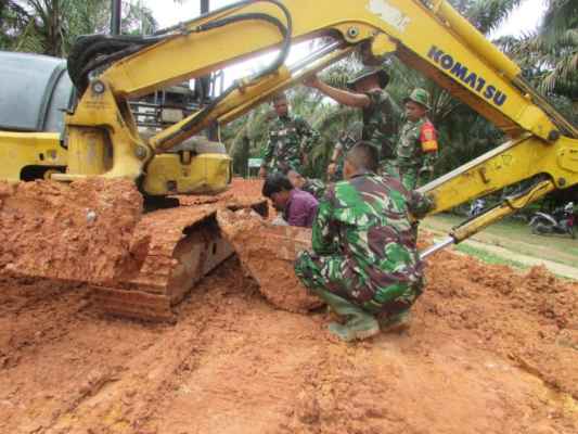 JAMBI- Satgas TMMD Kodim 0415/Batanghari bersama warga Desa Sungaiterap memasang rantai roda yang terlepas dari excavator saat digunakan untuk meratakan jalan, Kamis (25/3/2021).