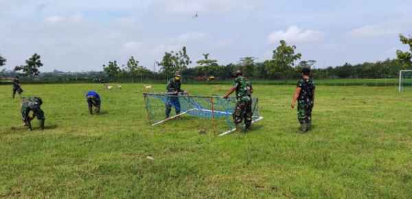 Anggota Satgas TMMD Ke- 110 Kodim 0813/Bojonegoro,Sertu maskobah Bergotong royong bersama rekan anggota satgas TMMD memindahkan tiang golpal di lapangan sepakbola Desa Ngrancang, Kecamatan Tambakrejo Kab. bojonegoro. (Pendim 0813)