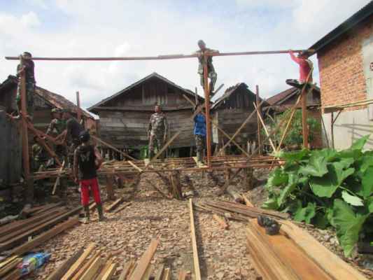 JAMBI- Warga Desa Sungaiterap rela berbagi makan siang, saat Satgas TMMD ke 110 Kodim 0415/Batanghari tengah membangun rumah yang dibedah di kawasan RT 05, Jumat (26/3/2021) siang.