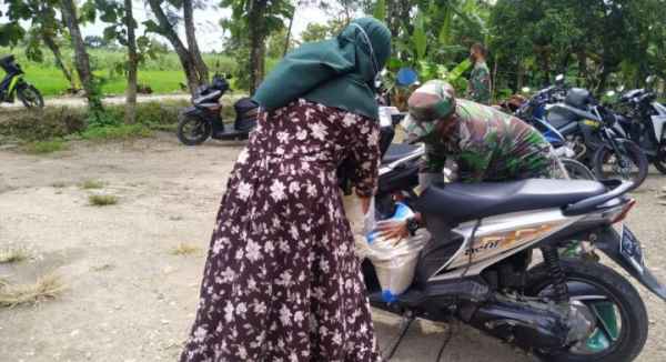 Bertempat di halaman Balai Desa Jatimulyo, anggota Satgas Kodim 0813/Bojonegoro, Sertu Maskun, nampak membantu warga mengangkat sembako.