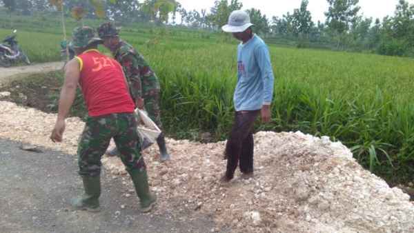 Kali ini tampak dua Anggota Satgas TMMD ke-110 Kodim 0813/Bojonegoro bersama seorang warga memperbaiki jalan Desa Jatimulyo, Kamis (18/3/2021).