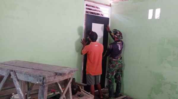 Pengerjaan rehab Aladin di rumah tersebut pada tahap pemasangan pintu. Di sana nampak, Kopda Imam Hariyanto, membantu kegiatan tersebut, Jum’at (19/03/2021).