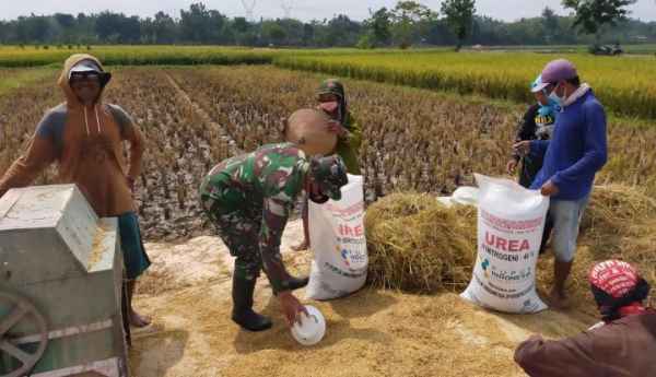 “Kita bantu warga panen padi hari, Ngedos padi manual dan gabah hasilnya langsung kita karungi,” terang Satgas TMMD ini, Jum’at (19/3/2021).