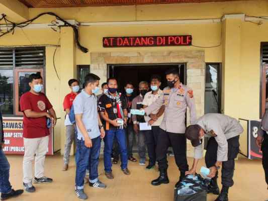 MUARABUNGO,-Waka Polres Bungo, Kompol Ridwan J.M Hutagaol, S.I.K., M.H bersama sejumlah anggota Polres Bungo membagi-bagikan masker kepada puluhan awak Media yang tergabung dalam Organisasi Pers Kabupaten Bungo, yang menggelar aksi unjuk rasa di depan kantor Polres Bungo, Rabu (02/6/21).