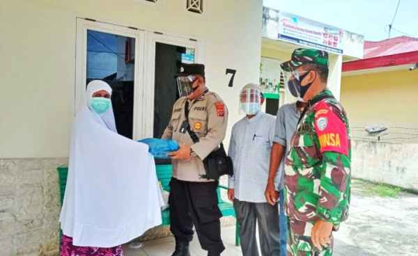 LHOKSEUMAWE – Personel Polres Lhokseumawe menyerahkan bantuan sembilan bahan pokok (sembako) kepada keluarga pasien yang positif Covid-19 di Gampong Jawa Baru, Kecamatan Banda Sakti, Kota Lhokseumawe.