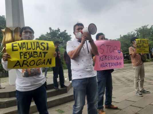 Dalam aksi itu, Plt Asisten Daerah (Asda) 3 Pemkot Tangsel, Sukanta menemui para wartawan.