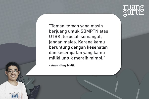 Saat itu ia sedang duduk, menggunakan headset dan memegang handphonenya dikutip dari laman ruangguru.com. Anas yang siang itu hanya ditemani sang ibu, mulai membagikan ceritanya menumbuhkan kembali semangat belajarnya yang sedikit banyak terbantu aplikasi belajar online
