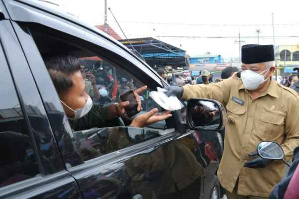 KABUPATEN MALANG- Bupati Malang, H. Sanusi membagikan 10 ribu masker di area pasar tradisional dan turun langsung di pinggir jalan.