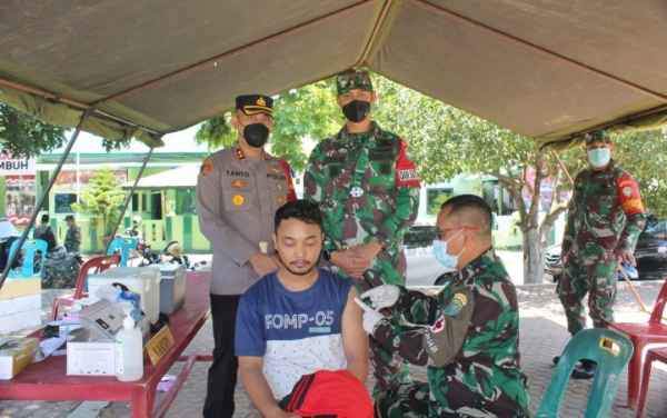 Kapolres Lhokseumwe bersama Dandim 0103 Aceh sedang melihat warga sedang di vaksin oleh TNI