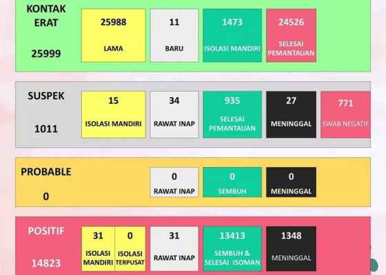 Berdasarkan update Instagram Dinas Kesehatan Kabupaten (DKK), saat ini kasus positif aktif turun menjadi 62 kasus. Terdiri dari 31 orang isolasi mandiri dan 31 orang rawat inap dirumah sakit. Untuk kasus positif meninggal naik empat menjadi 1.348 kasus.