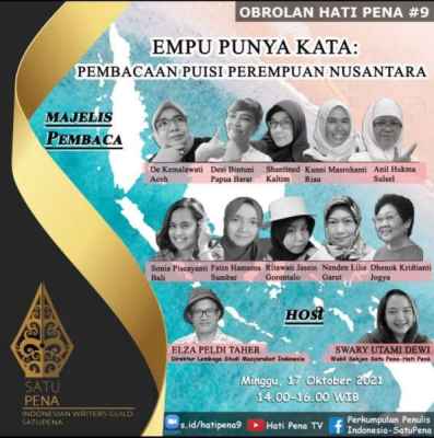 Kegiatan bertema “Empu Punya Kata: Pembacaan Puisi Perempuan Nusantara” itu diadakan oleh Perkumpulan Penulis Indonesia SATUPENA, melalui acara Obrolan HATI PENA #9.