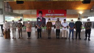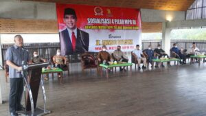 TULANG BAWANG BARAT – Bupati Tulang Bawang Barat Umar Ahmad, SP memberikan sambutan selamat datang kepada H. Ahmad Muzani, Wakil Ketua MPR RI pada acara Sosialisasi 4 pilar MPR RI di Sesat Agung Bumi Gayo Komplek Islamic Center, Senin (30/08/2021).