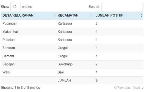 Saat ini, dari 12 kecamatan, sudah delapan kecamatan nol kasus positif corona aktif. Masing-masing Kecamatan Bendosari, Gatak, Mojolaban, Nguter, Polokarto, Tawangsari, Bulu, dan Kecamatan Weru. Positif corona aktif masih ada di Kecamatan Kartasura, Grogol, Sukoharjo, dan Kecamatan Baki.
