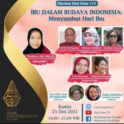 JAKARTA – Perkumpulan Penulis Indonesia, SATUPENA, akan merayakan Hari Ibu dengan diskusi dan pembacaan puisi. Setidaknya lima penyair akan berpartisipasi membacakan puisi mereka. Tema acara itu adalah “Ibu Dalam Budaya Indonesia: Menyambut Hari Ibu.”