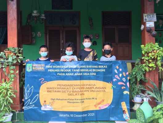JAKARTA – Mahasiswa Program Studi Ilmu Komunikasi Universitas Nasional gelar kegiatan Pengabdian Kepada Masyarakat (PKM) berupa “Mini Workshop Daur Ulang Barang Bekas Menjadi Produk Yang Bernilai Ekonomi” di Perkampungan Betawi Setu Babakan, Jakarta Selatan Sabtu (18/12/2021), dengan tema melatih kemampuan kreativitas pada anak-anak usia dini.