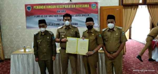 Penandatanganan Kesepakatan Bersama tentang Kerjasama Antara Daerah ini dilakukan oleh Bupati Sarolangun Drs.H.Cek Endra dengan Bupati Batang Hari Muhammad Fadhil Arief.
