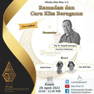 Obrolan Hati Pena #36 itu akan diadakan di Jakarta pada Kamis (28/4), pukul 20.00-22.00 WIB. Sebagai narasumber adalah Guru Besar Filsafat Islam, Prof. Dr. Mulyadhi Kartanegara. Pemandu diskusi adalah Amelia Fitriani dan Elza Peldi Taher.