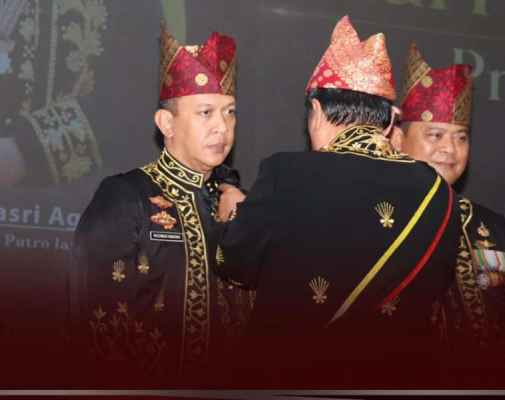 Jambi – Lembaga Adat Melayu Jambi sematkan pin Adat Melayu sebagai tanda kehormatan kepada Kapolda Jambi, Irjen Pol A. Rachmad Wibowo dalam rangka memperingati hari Adat Melayu Jambi di Aula Rumah Dinas Gubernur Jambi, Sabtu, 02/07/2022.