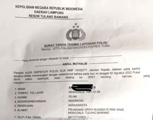 Adapun laporan polisi tersebut sesuai dengan nomor : LP/B/280/VIII/2022/SPKT/POLRES TULANG BAWANG/POLDA LAMPUNG tanggal 02 Agustus 2022 dengan dugaan tindak pidana Undang-undang no 19 tahun 2016 tentang perubahan atas undang-undang nomor 11 tahun 2008 tentang informasi dan transaksi elektronik pasal Jo pasal 28 ayat 2.