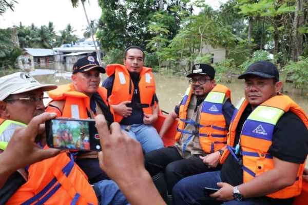 ACEH UTARA – Pj Bupati Aceh Utara Azwardi, AP, M.Si bersama Kepala Subdirektorat Fasilitas Penyelamatan dan Evakuasi BNPB Drs Gatot Satria Wijaya, MS mengantar bantuan untuk korban banjir di dua Gampong yang terisolir di Kecamatan Lhoksukon, Minggu (9/10).
