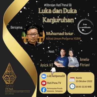 Obrolan Hati Pena #58 tentang tragedi Kanjuruhan itu akan diadakan di Jakarta pada Kamis, 13 Oktober 2022, pukul 19.00-21.00 WIB. Akan berbicara Muhamad Isnur, Ketua Umum Pengurus YLBHI. Diskusi akan dipandu oleh Anick HT dan Amelia Fitriani.