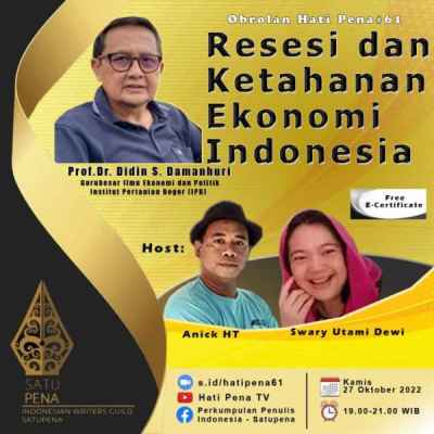 Obrolan Hati Pena #61 tentang resesi ekonomi itu akan diadakan di Jakarta pada Kamis, 27 Oktober 2022, pukul 19.00-21.00 WIB. Akan berbicara Prof. Didin S. Damanhuri, Guru Besar Ilmu Ekonomi dan Politik Institut Pertanian Bogor. Diskusi akan dipandu oleh Swary Utami Dewi dan Anick HT.